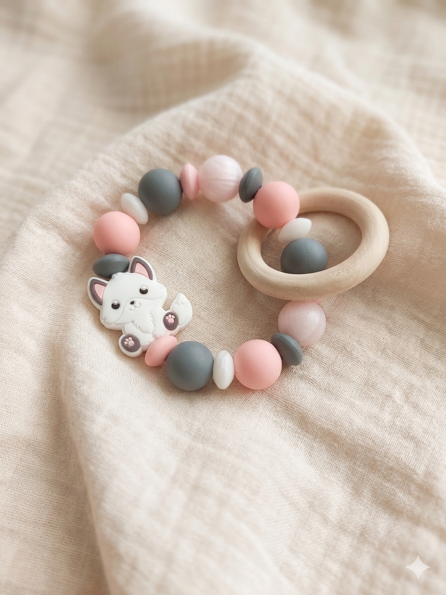 Un adorable petit renard blanc en silicone souple est au cœur de cet anneau de dentition. Il est entouré de perles aux tons pastel de rose, de gris et de blanc, créant une harmonie douce et apaisante. Un anneau en bois naturel complète l'ensemble, offrant des textures variées pour le plaisir de bébé.